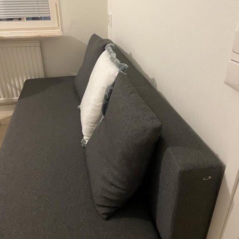 Helt ny bäddsoffa 210x85 cm, sittdel 190x55 cm, liggdel 190x106 cm. Lite dåligt ljus i rummet så den ser ljusare på en del.