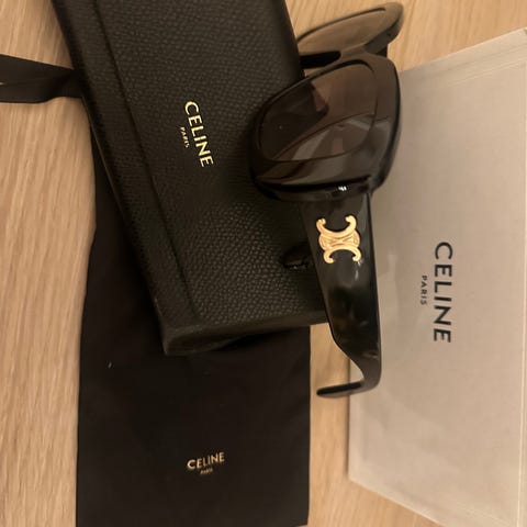 Celine solglasögon, köpta från NK i Stockholm. Glasögonen har ett stilrent och klassiskt utseende med mörka linser och bruna bågar. Levereras med svart fodral och putsduk samt kvitto.