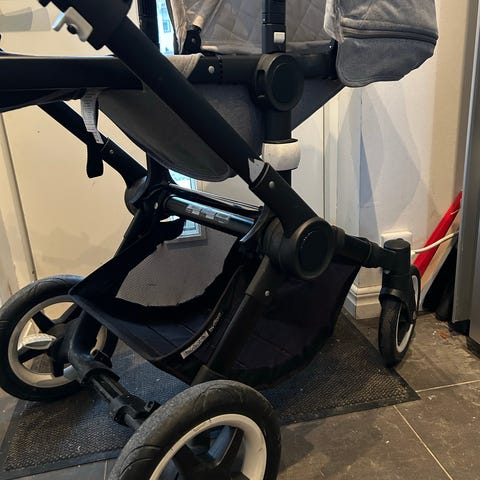 Bugaboo Bee 5. Chassi, hjul och handtag är Bee 5, dessa är i mycket fint skick och inte så mycket använt. Köptes nytt när det gamla Bee 3 chassit gick sönder. Sittdel, varukorg och suffletter (grå sommar sufflett och svart vanlig) är Bee 3. Aningens blekta i tygerna annars i fint skick.