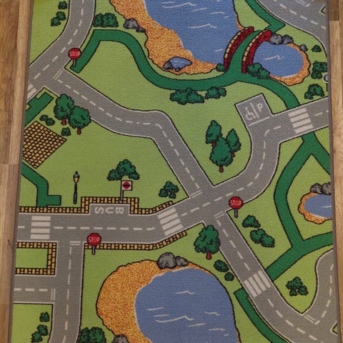 Kombinerad lekmatta, bilbana och leksakssäck med smidig dragsko som gör att man är igång med lek omedelbart och lika snabbt har samlat ihop efter leken.