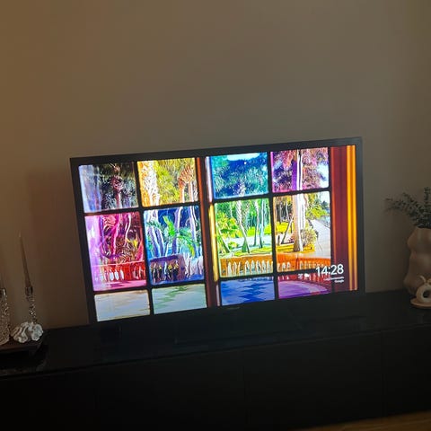Tvn flickrar alla tänkbara färger och ränder över skärmen en stund (ca 2-3 min) efter att den sätts på och fortsätter göra så tills den stängs av. Alla funktioner fungerar, utsidan är som alldeles ny och bildkvaliteten är mycket bra (dock bara i några minuter 😅).