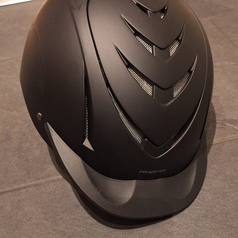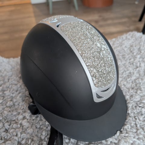 HKM ridmössa i svart färg, storlek S. Hjälmen har en matt finish med en dekorativ kromdetalj på toppen. Insidan är vadderad för komfort och säkerhet, med justerbara remmar för att säkra passformen. Produkten är avsedd för ridning och uppfyller säkerhetsstandarder.