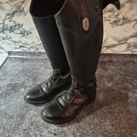 Crw strl 37 Ovation ridstövlar i svart läder för unisex. Stövlarna har en hög skaftdesign med dragkedja baktill och snörning framtill vid foten.