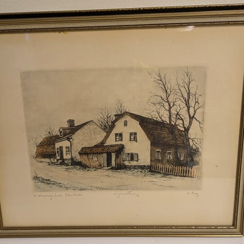 Teckning av ett hus i landskap av Wiveca Claeson (1920-2004). Signerad med namn på baksidan. Bildmåttet är 28 c 38,5 cm. I vit passepartout, 8,5 cm2 bred.