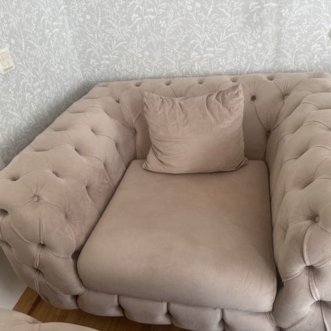 Den här favoritfåtöljen måste tyvärr säljas eftersom vi inte längre har plats för den. Fåtöljen är älskad för sitt breda, djupa ryggstöd og de bekväma armstöden som omsluter dig som en kram, perfekt för både avkoppling och mys. Den är vel använd av hela familjen och har varit en av de mest omtyckta möblerna i vårt hem. En riktigt härlig fåtölj för dig som vill ha både stil och komfort!