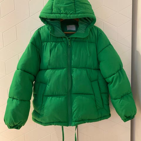 Vadderad mysig puffer, ljust beige i lite glansigt material och fast huva.
