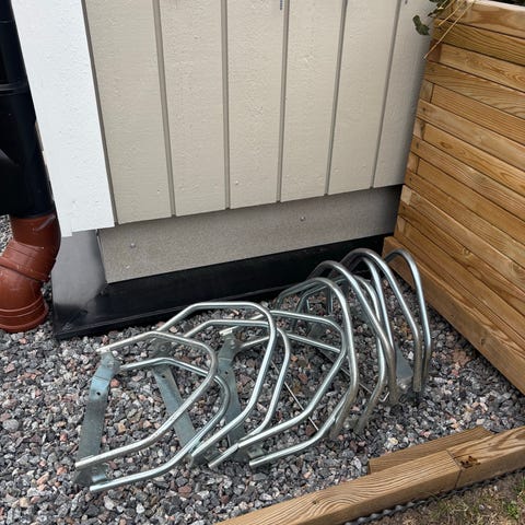 Cykelställ för parkering av upp till fyra cyklar, varmförzinkat. Enkel och robust design. Passar för utomhusbruk och ger stabilt stöd för cyklar i olika storlek och med varierande däcktjocklek. Har stått inomhus i garage.