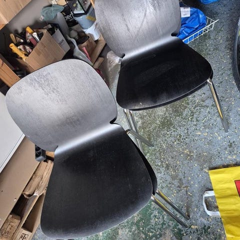 4 st snygga och bekväma stolar med metallben. Stolar har en enkel design med en formgjuten sits och ryggstöd och en ram av metall. Passar för användning som matstol eller extra sittplats i olika rum.