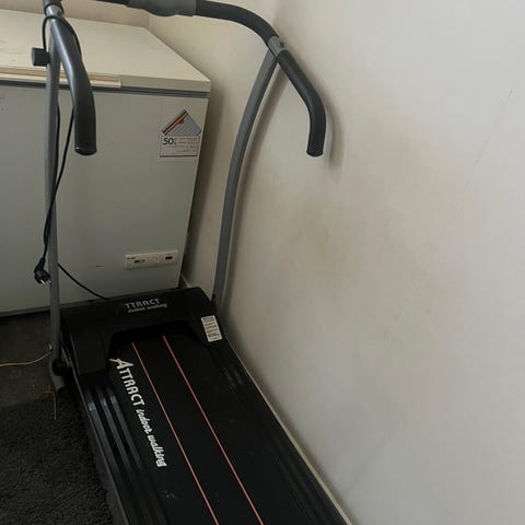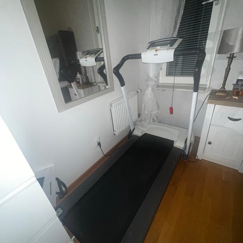 Trust Fitness Treadmill löpmaskin i svart färg. Utrustad med digital display och kontrollpanel med knappar för hastighetsjustering. Löpyta med halksäker yta och robust ram. Designad för hemmabruk och träning inomhus.