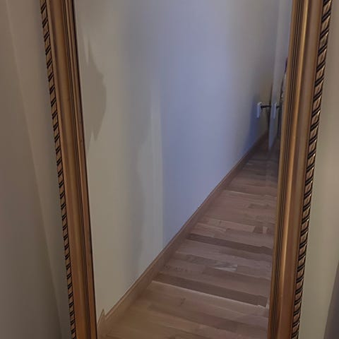 Fin oval spegel med vit dekorerad ram i shabby chic/antik stil. Passar perfekt i hall, sovrum eller vardagsrum. Fint skick.