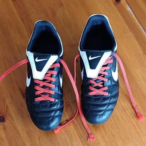 Nike Tiempo fotbollsskor i svart färg, storlek 43. Skorna är tillverkade i lädermaterial och har dobbar för bra grepp på gräsytor. Modellen är avsedd för vuxna och är designad för fotbollsspel.