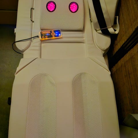 • Levereras komplett med alla tillbehör: fotspa-bassäng, LED-system, vattenfontän, slangar, fotstöd, elbox/kontrollpanel och full madrass i grått läder.