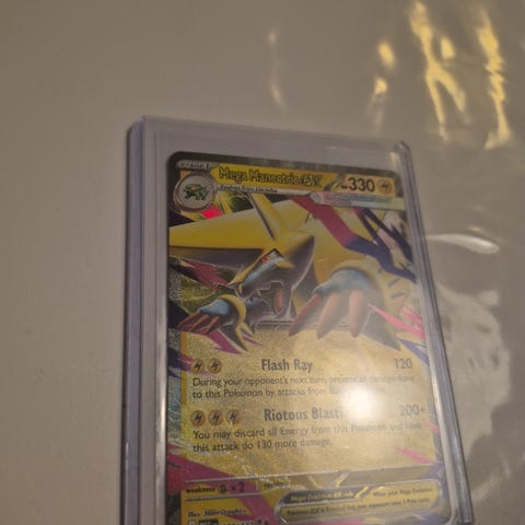 Pokémon Mega Mawile EX samlarkort med 270 HP. Kortet har två attacker: Gobble Down som gör 80 skada och Huge Bite som gör 260 skada. Kortet är i plastficka för skydd och är avsett för samling och spel.
