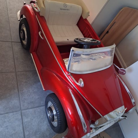 Audi elektrisk barnbil i röd färg med svart inredning. Utrustad med ratt och pedaler för körning. Lämplig för barn och tillverkad för inomhus- och utomhusbruk.