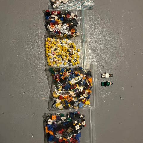 Lösbitar och många figurer många figurer från t.ex ninjago och starwars mycket lösa bitar också och bitar för att bygga mycket