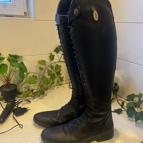 CRV Horsehead ridstövlar i svart läder, herrstorlek. Stövlarna är höga och har dragkedja + resår. Sulan är av gummi med mönster för grepp.