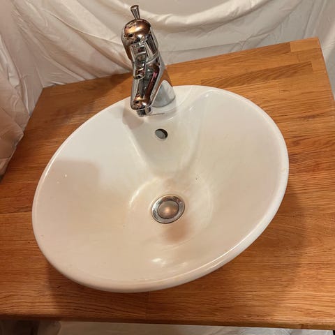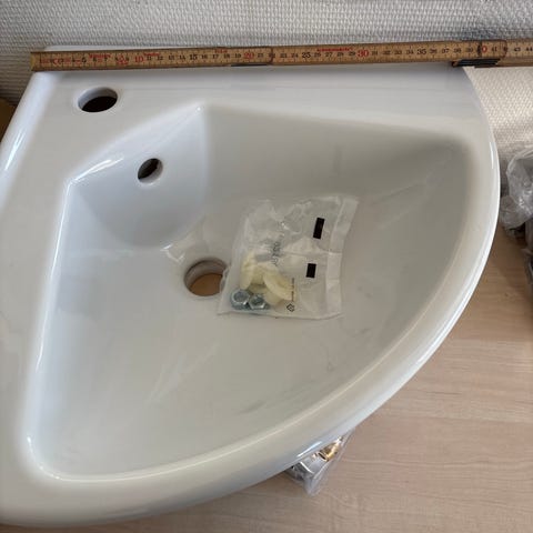 Jättefint hörnhandfat från Swedberg 38x38 cm med blandare damixar, perfekt till den mindre toaletten eller sommarstuga.