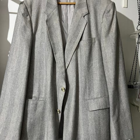 Kavaj vet ej storlek. Den är för liten för mig och jag är 185cm lång och väger runt 90kg. Kan inte minnas när den användes senast. Har hängt i förrådet i många år. Djur finns i hemmet. Kavajen finns i Öxnehaga. Pris: 50kr
