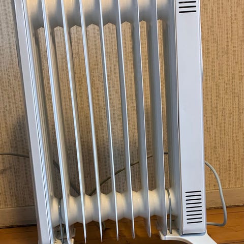 Tre oljefyllda element. Det vänstra (vita) från ÖoB har fläkt, pris 300, de två gråa till höger är utan fläkt och från Biltema; en av dessa 250 det andra som har ett hjul som är löst, 200.