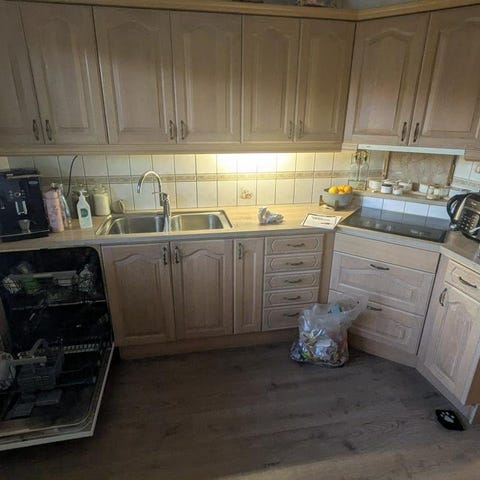 Ned monterad kök med vitvaror ex fäkt (sönder) elektrolux diskmaskin från 2025. Stor kyl och frys från husqvarna samt spis och mickroung