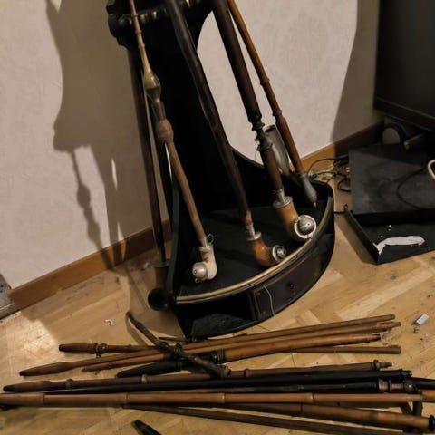 Allt som du ser på bilden säljs tillsammans som ett paket. Utöver det större pipstället så finns det ett mindre pipställ i hyllan som egentligen ska hänga eller stå mot vägg. Finns fäste på baksidan.