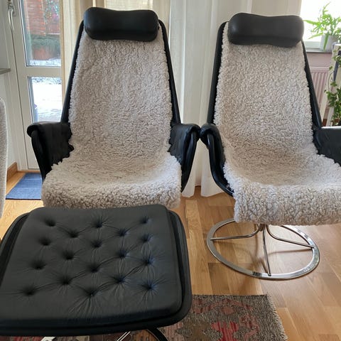Vi säljer nu vår fåtölj från ca 1968 kan behöva rengöras i bakre tyget. Det finns en tillhörande kudde som kan monteras på i nacken med lite kärlek. Kan den bli som ny.