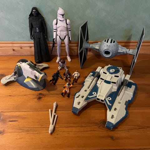 Star Wars samling bestående av olika actionfigurer, modellfordon och böcker. Inkluderar figurer från olika karaktärer, flera rymdskepp och fordon i olika storlekar, samt flera böcker och serietidningar relaterade till Star Wars-universumet. Artiklarna är av varierande storlek och material, avsedda för samling eller visning.