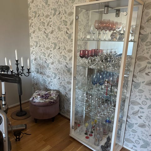 Vitt vitrinskåp med två glasdörrar och flera hyllplan. Skåpet lämpar sig för förvaring och exponering av prydnadssaker, glas eller andra föremål. Justerbara hyllor ger möjlighet att anpassa utrymmet efter behov. Passar i vardagsrum, matsal eller hall.