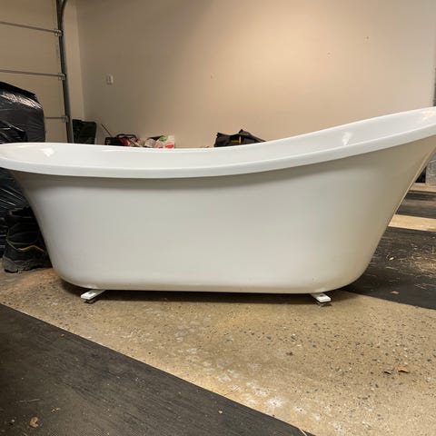 Fint helgjutet badkar i akryl med vita tassar i smidig storlek.