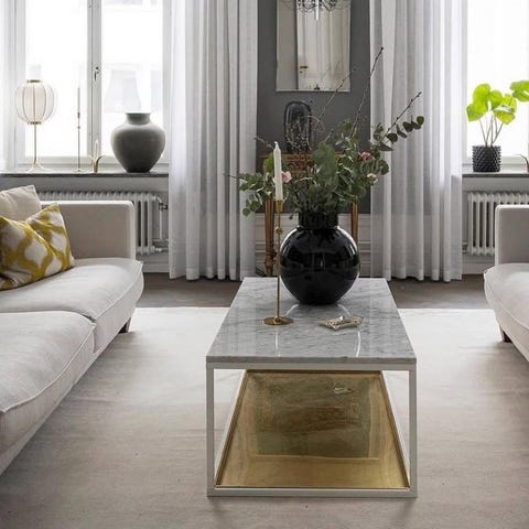 Stilrent marmorbord med vitt stativ och mässingsplåt undertill. Inköpt på Plan Ett i Stockholm ca 2015. Mått: 60x120 cm, höjd 40 cm.