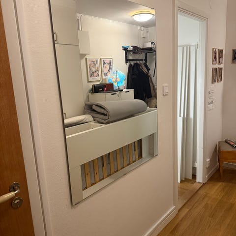 Spegel i mörkt/tonat glas. 80cm i diameter. Finns på högalidsgatan i Hornstull.