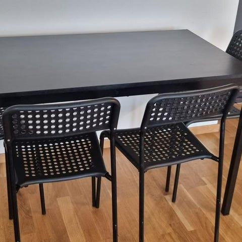 Rubust matbord inkl 4 stolar, finns tilläggsskiva på ena sidan att fälla upp vid behov.