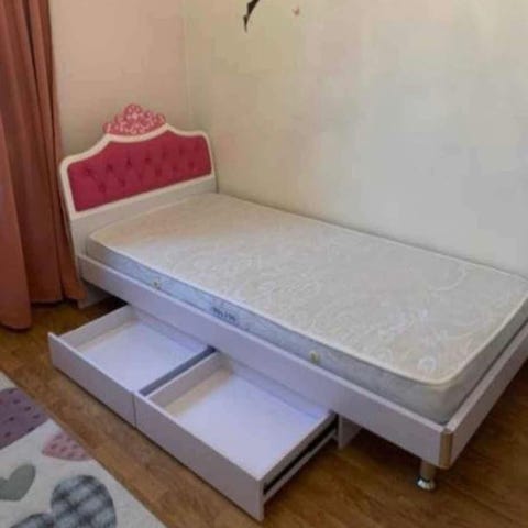 Det ingår garderob, säng, madrass, skrivbord, nattduksbord, hjärt - gardiner, matta och en väggklocka.
