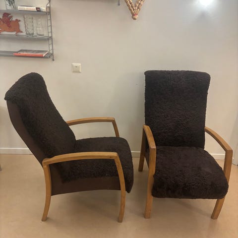 2 st fina och varma Gazell fårskinnsfåtöljer med 2 st fotpallar som är inköpta