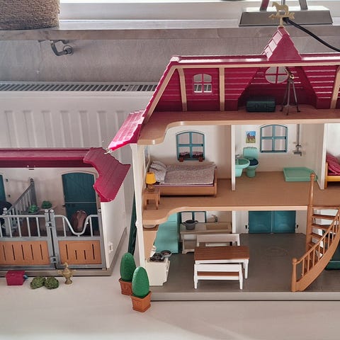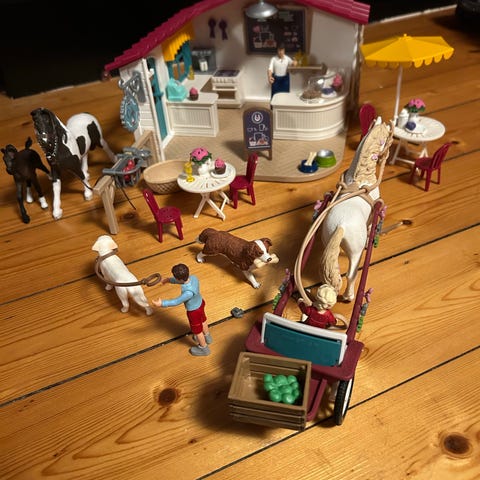 hej! säljer en schleich veterinärsbil. settet är i gått skick, men tyvärr saknas bakre fönsterrutan och grimma till fölet. förutom detta är alla delar tillgängliga. settet består av veterinärsbilen som innehåller: röntgenapparat, skrivbord, pall och dator. en läkarväska: spruta, medikamentflska, bandage (lila) och ett stetoskop. dessutom finns en veterinär, ett hannoveranarföl och äpplen. man kan stänga och öppna bilens framdörrar och öppna och ta av taket. det går även att öppna ena sidoväggen. (jag säljer mer schleich och lego)