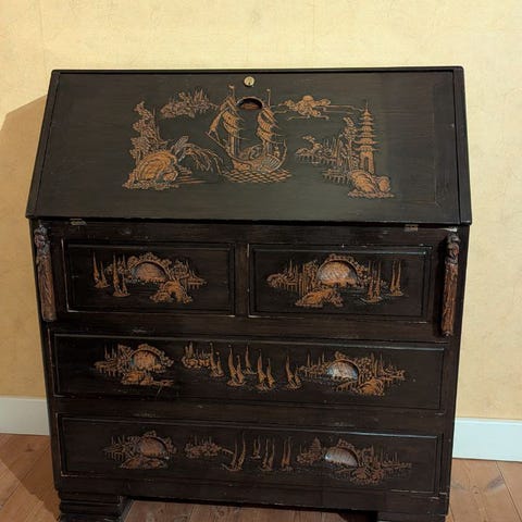 Sekretär i trä med flera lådor och förvaringsfack. Har en marmorskiva på toppen. Passar för förvaring och skrivarbete i hem eller kontor.