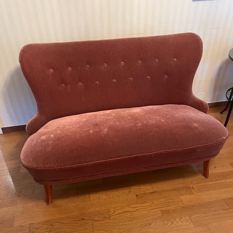 Antik rosa sammetssoffa. Lite nött på sitsen i övrigt i fint skick.