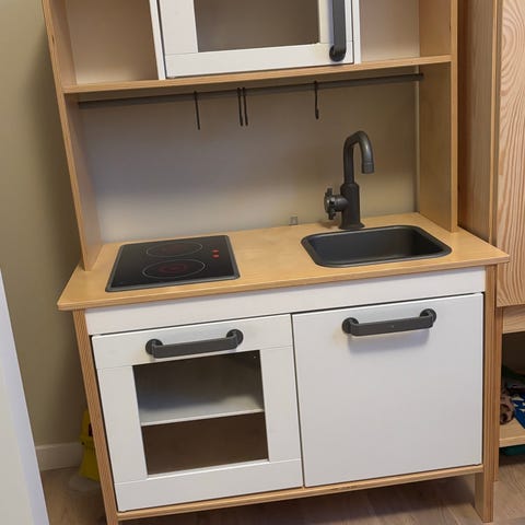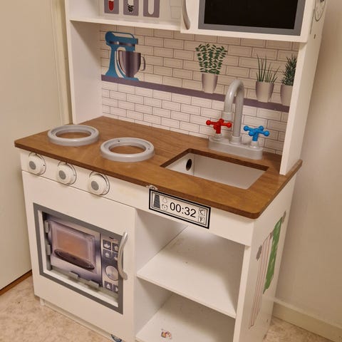 Kinderkraft Lekkök för barn i vit trä. Köket har spis med knoppar, ugn med handtag och hyllor för förvaring. Passar för barn och är utformat för lek och lärande. Det är i helt ok skick, de skavanker som jag hittat har jag tagit bilder på! Lite saker på bilden ingår.
