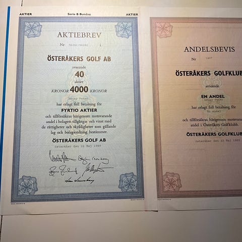 2 st golfaktier Österåkers golfklubb för varje eller bud