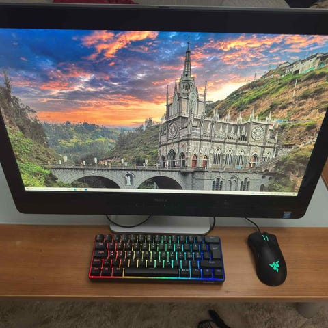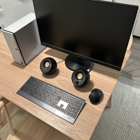 Desktop including two Lenovo monitors, Logitech keyboard and mouse