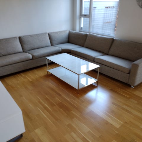Rymlig och bekväm hörnsoffa i grått tyg med mörka sidostöd. Stor schaiselong, gott om sittplatser och mjuka ryggkuddar. Stabil, hel och fräsch.