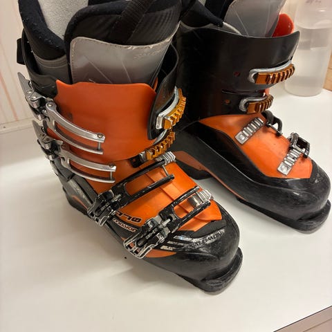 Slalompjäxor Salomon. Storlek 29 Mycket lätt att ta på. Bara öppna på ”vid gavel”, sticka ned foten och stänga med 2 spännen. Du kommer att vara först ut i pisten😉