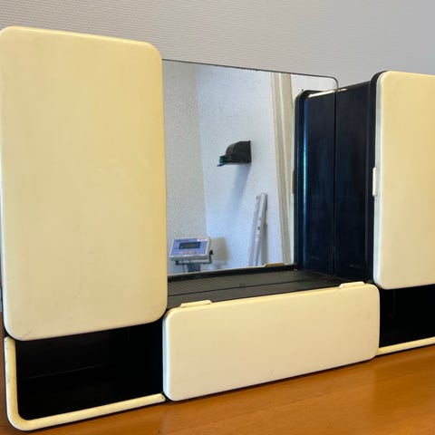 Vit badrumsskåp med påbyggnadsdel med lysrör och eluttag.