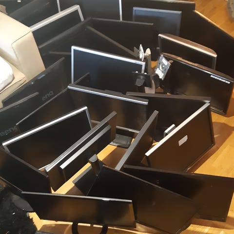 Set up med fyra LG 24” bildskärmar för trading eller gaming. Bara att plugga i och köra! Skärmarna är daterade 2011 men inte mycket använda.