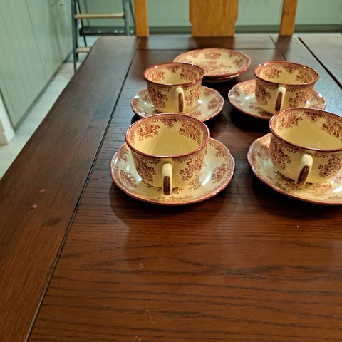 Setet består av 6 små koppar med tillhörande fat, i vinröd och vit färg med vacker guldkant.