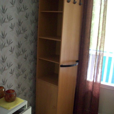 Fyra hyllplan , varav tre bakom en dörr med spegel på insidan, och fyra lådor för mössa/vantar.