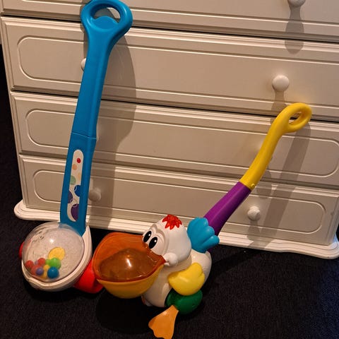Fisher-Price barnleksak gåvagn med kulor. Gåvagnen är blå och utformad för små barn som lär sig gå. Den har en behållare med färgglada kulor som rullar när vagnen skjuts framåt, vilket stimulerar barnets motorik och koordination. Ingen musik eller ljud inbyggd på denna.