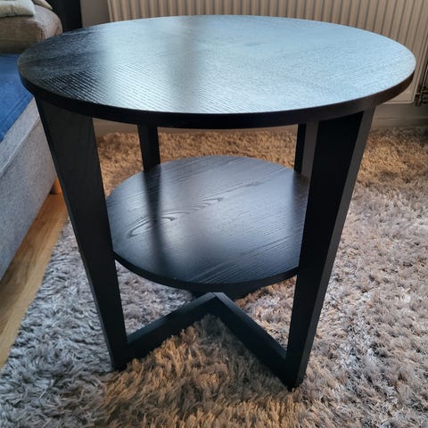 Vitt runt soffbord med en diameter om 80 cm. Det finns en del skavanker såsom repor på skivan samt avskavd färg på benen. Bordet blir lite rangligt efter ett tag men det är bara att skruva åt. Se bilder för skavankerna.