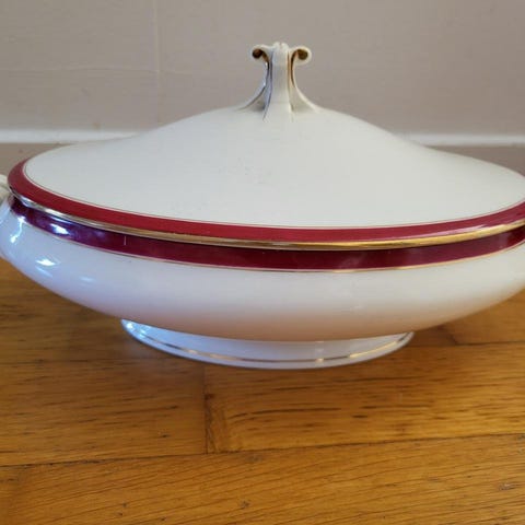 Antik Terrin eller soppskål med lock i porslin. Skålen har ett blommönster runt kanten och en gammeldags vit basfärg. Lockets handtag är dekorativt och praktiskt för servering. Produkten är lämplig för servering av soppa eller andra varma rätter.