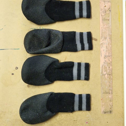 Set med fyra par hundstrumpor i julmotiv. Strumporna är röda med svarta och vita detaljer som liknar ett bälte och päls. Materialet är mjukt och strumporna har halkskydd på undersidan i form av vita tassavtryck. Passar till små hundar beroende på storlek. Från pytte Yorkie. Töjbara.